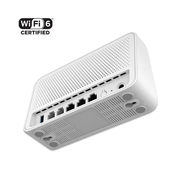 در قسمت پشت دستگاه، پورتهای شبکه گیگابیتی، پورتهای FXS برای تلفنهای آنالوگ، درگاه USB 3.0 و دکمههای کنترل قرار گرفتهاند. این طراحی عملکردی باعث دسترسی آسان به تمام قابلیتهای دستگاه میشود. ابعاد کوچک و وزن کم این روتر (۱۸۵ گرم) نیز نصب و جابجایی آن را بسیار ساده کرده است.