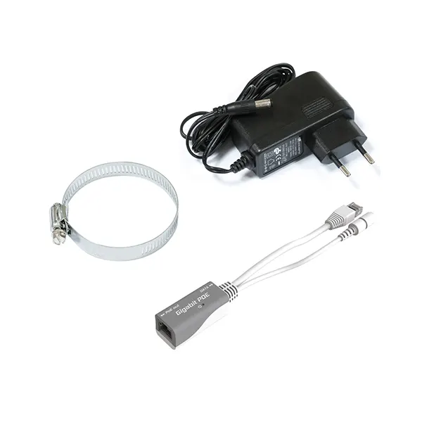 - محتویات جعبه:دستگاه، آداپتور برق ۲۴V، PoE Injector گیگابیت، یک عدد بست کمربندی (Hose Clamp).